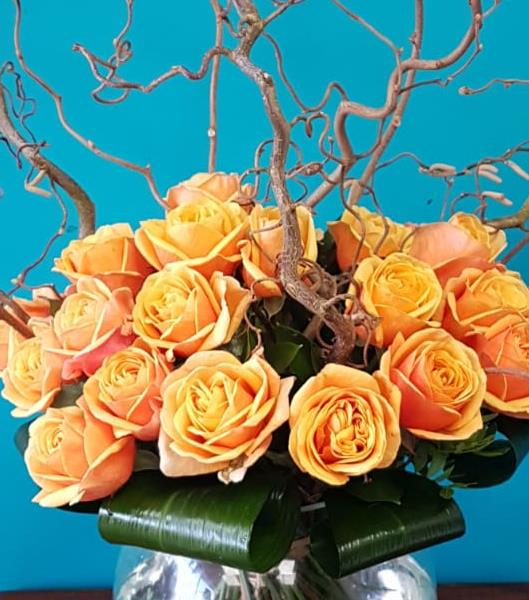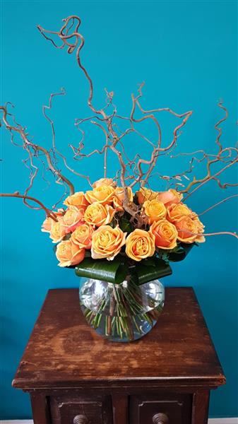 24 large roses in the colour of your choice with willow in extra large globe vase