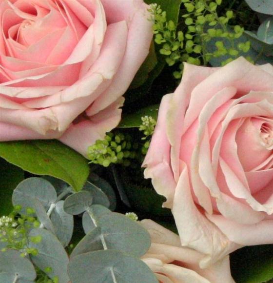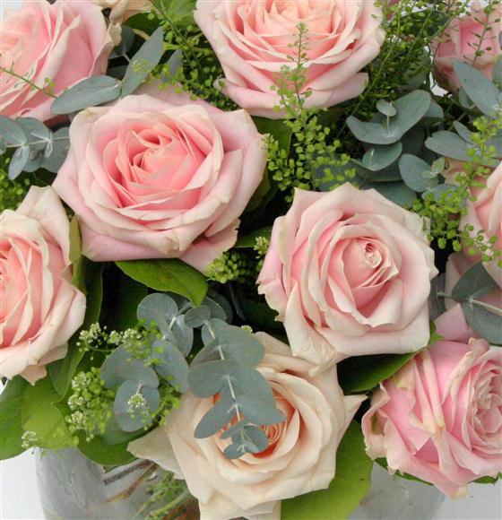 A dozen pretty, pale pink roses combined with mixed foliage to create a sweet and delicate bouquet.