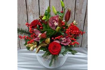 A beautiful bouquet that includes red naomi roses, red orchids, ilex, red lily and finished with gold ruscus and pine