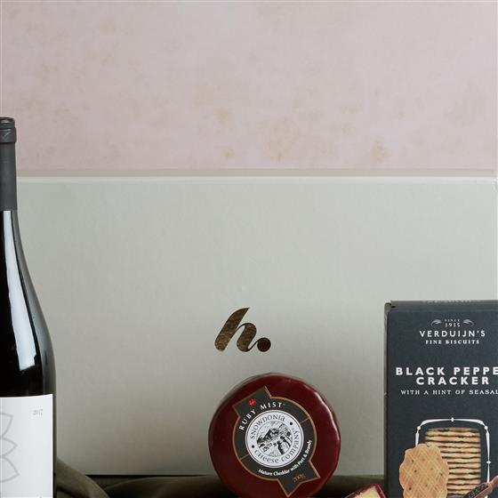 Las Carlinas Garnacha 75cl, 75g Verduijns Savoury Black Pepper & Seasalt Crackers, Snowdonia Cheese Ruby Mist 200g, Medium Gift Box Outer 350mm x 207mm x 110mm.