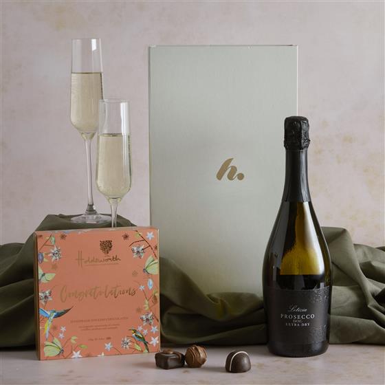 75cl Letizia Prosecco Spumante DOC Extra Dry,Holdsworth Congratulations Chocolates Gift Box 110g, Medium Gift Box Outer 350mm x 207mm x 110mm.