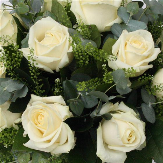 An elegant and stylish bouquet of 12 white roses mixed with a variety of contemporary foliage.