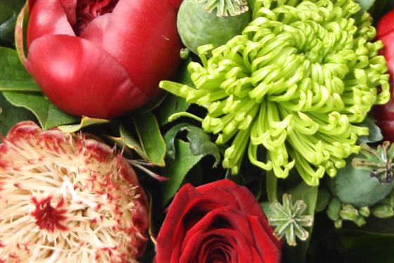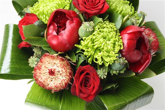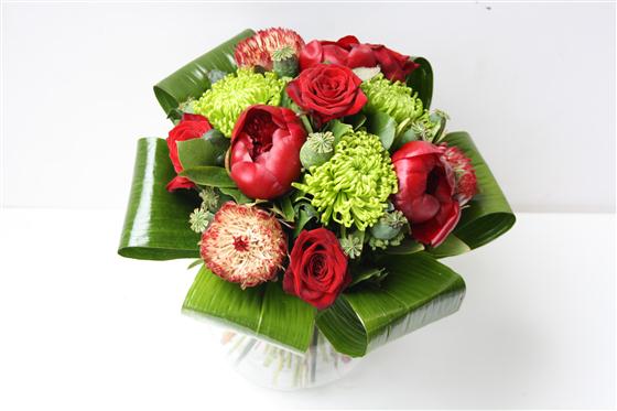 An exotic collection of red and lime blooms including proteas, roses and shamrock blooms - between September and May each year, the peonies will substituted as they are out of season.