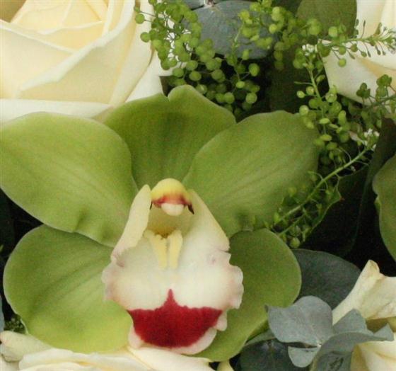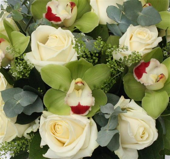 Six (standard) or a dozen (medium) long stemmed white roses and green cymbidium orchid heads. An exotic twist on a classic bouquet.
