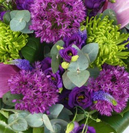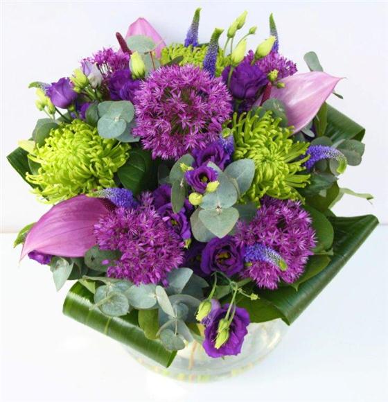 An unusual purple and lime hand-tied including lisianthus, anthuriums, allium, shamrock blooms and veronica.