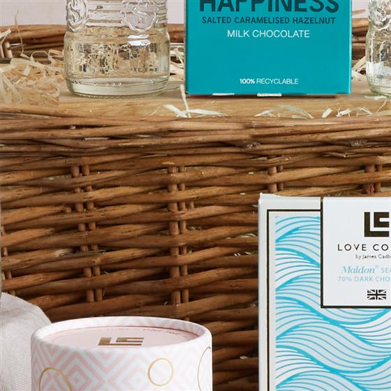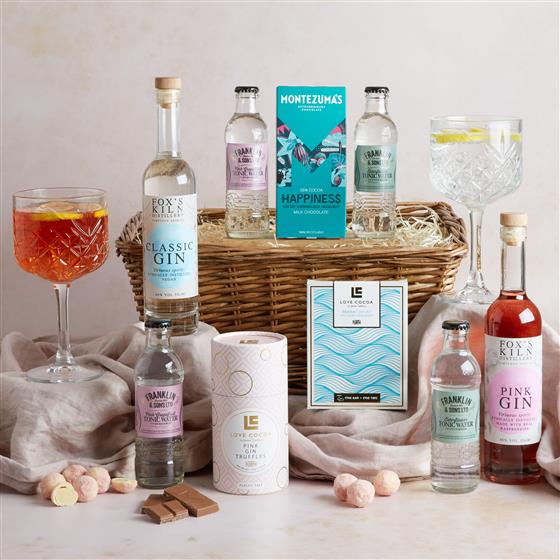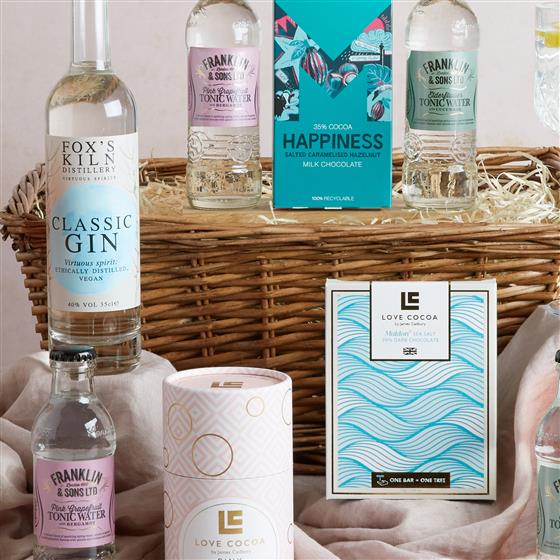 Franklin & Sons Pink Grapefruit tonic 200ml,Franklin & Sons Elderflower with Cucumber 200ml,35cl Classic Gin Fox Kiln, Foxs Kiln Pink Gin 35cl,Love Cocoa Maldon Sea Salt Dark Chocolate Bar 75g,Love Cocoa Pink Gin Truffles tube 150g,90g Montezuma Happiness chocolate bar,430mm/17", Medium Dyed Split Willow Tray (400 X 310 X 180).