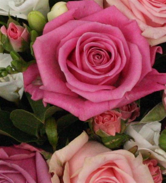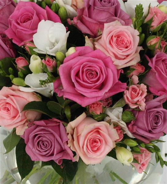 An abundance of multi tonal pink roses combined with highly scented white freesias. A fragrant delight.