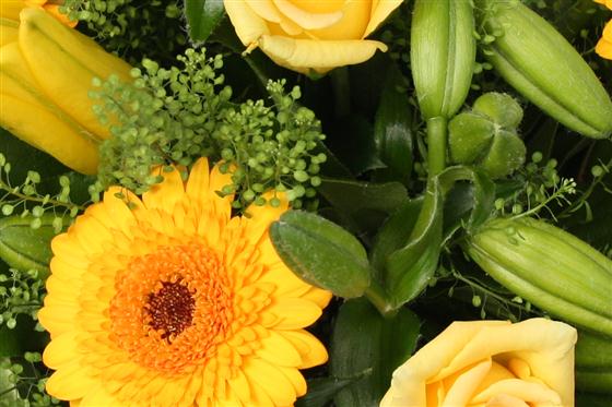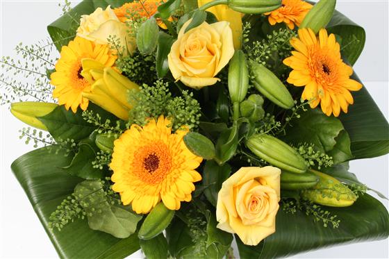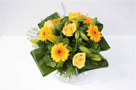 A vibrant bouquet of golds and contrasting dark greens, including roses, gerberas and lilies