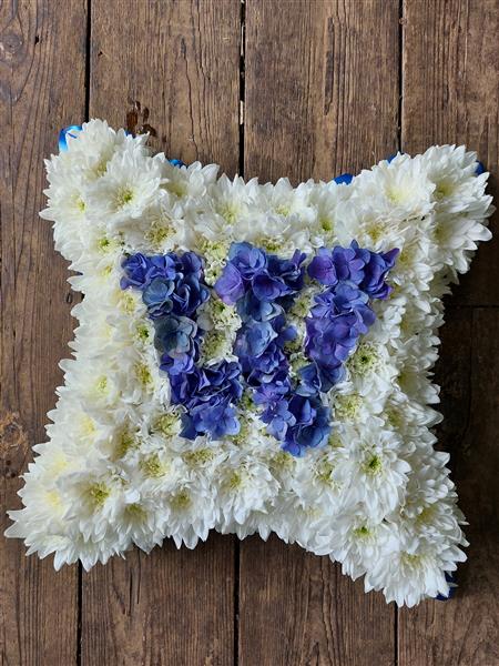 Initals spelt out in danty flower heads on a 12 inche cushion. Please Specify the Inital and colour you would like