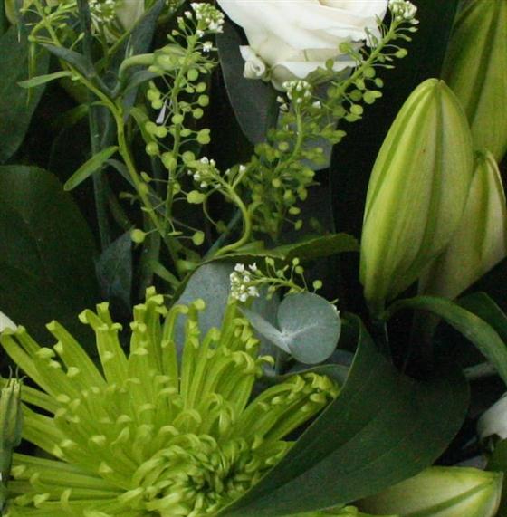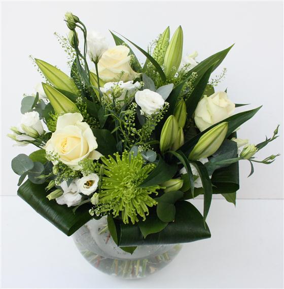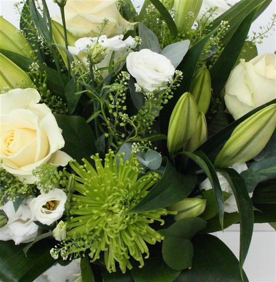 Zesty limes and crisp whites create this stylish bouquet, including scented oriental lilies, roses and lisianthus.