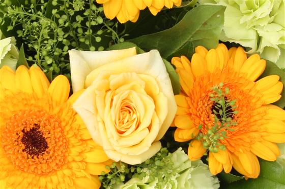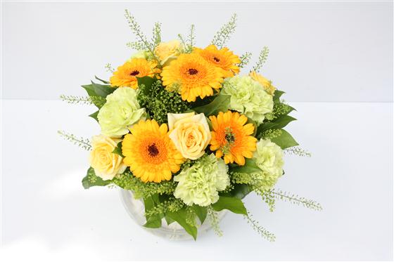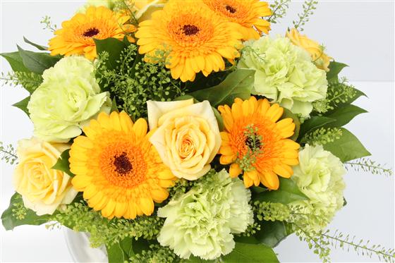 Bright golden gerberas, lemon roses and pastel green carnations hand-tied and presented in water.