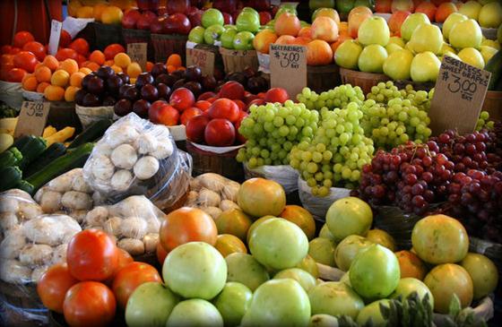 The mixed basket contains a mixture of seasonal fruits, along with the usual apples, banannas, pears, oranges and grapes.