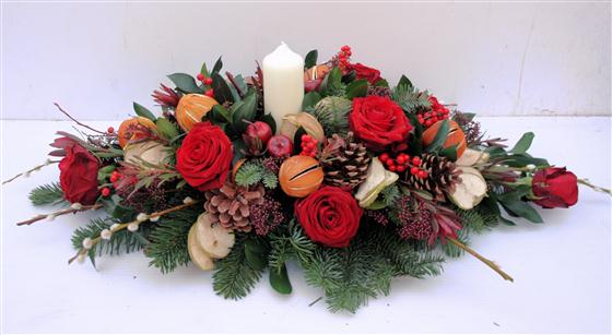 A rich and warming table centre filled with lots of Christmas glory includes cones, berries, whole oranges, apple slices, red roses, red skimmia, pussy willow and blue pine.