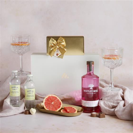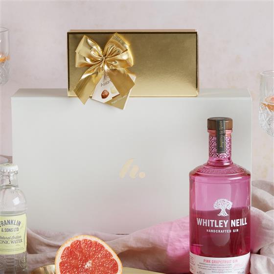 Franklin & Sons Natural Indian Tonic Water 200ml,Whitley Neill Pink Grapefruit Gin 70cl,Hamlet Gold Box Assorted Chocolates 125g, Medium Gift Box Outer 350mm x 207mm x 110mm.
