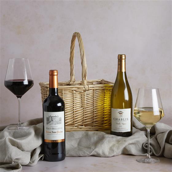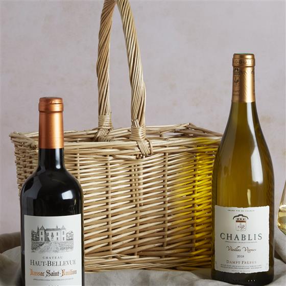 75cl Chateau Haut Bellevue St Emilion 2016, 75cl Chablis Domaine E Dampt 2016/17 Euros, 2 Bottle Wicker Wine Carrier.