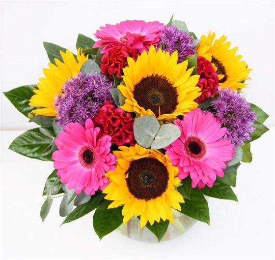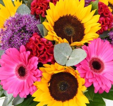 Stunning sunflowers, alliums, celosia and gerberas create a dazzling bouquet.