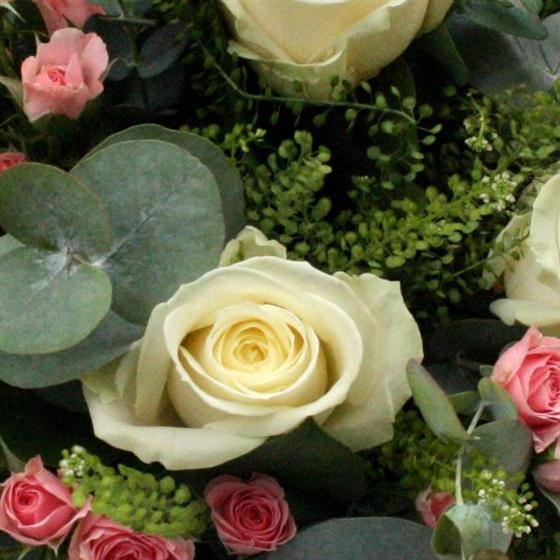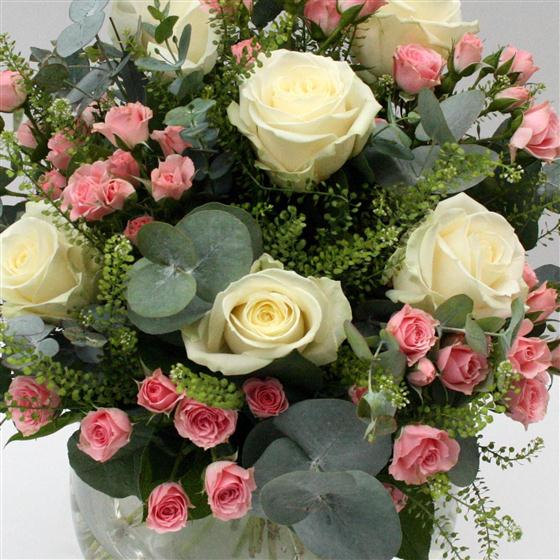 Six white roses presented with delicate, pink spray roses and mixed foliage. A truly special gift.