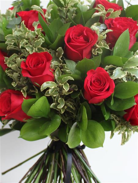 A classic hand-tied bouquet of 12 red Rhodos roses and mixed foliage including eucalyptus and salal tips.