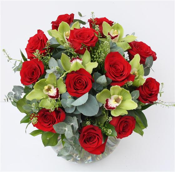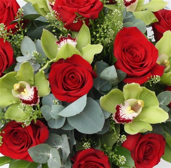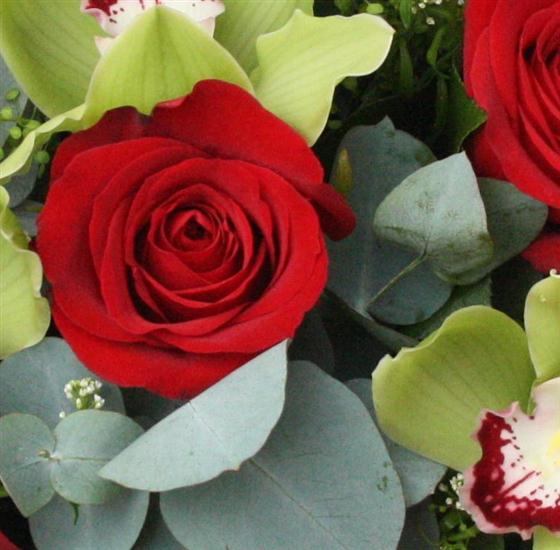A twist on a classic rose bouquet, this stunning hand-tied of red roses includes cymbidium orchid heads for an exotic look.
