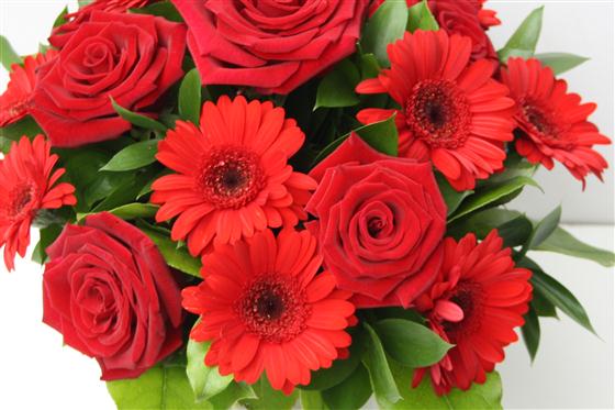 A ruby red bouquet of gerberas and rich, red roses interspersed with dark green foliage.