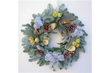 A 12" wreath that includes green apples, green apple slices, cinnamon sticks, cones and silver bows.