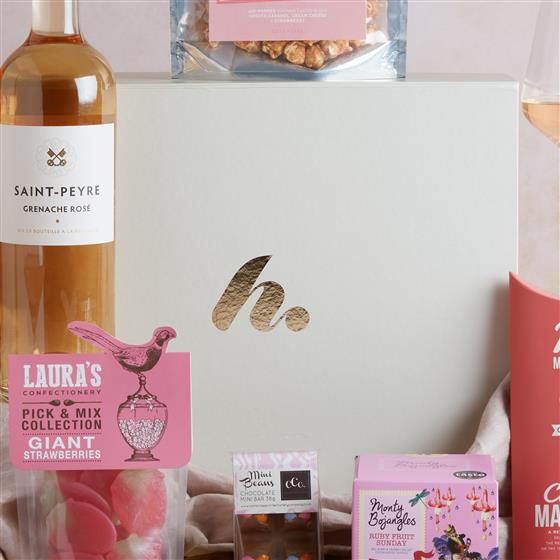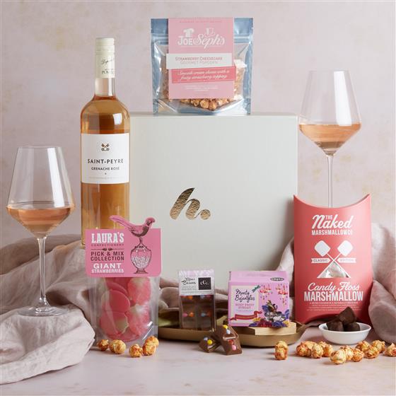 St Peyre Grenache Rose,J&S Strawberry Cheesecake popcorn snack pack 32g,38g CCC Milk Choc With Beans,Lauras Giant Strawberries pouch 150g,Candy Floss Naked Marshmallows 100g,Monty Bojangles Ruby Fruit Sunday Truffles 100g,Large Gift Box (33x 27 x 12)