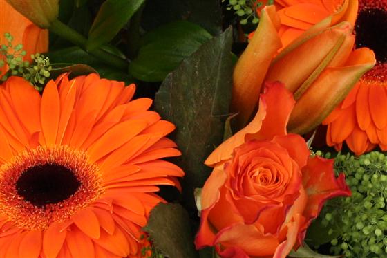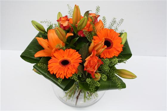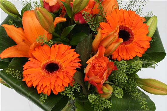 a bright and cheerful orange bouquet of lilies, roses and gerberas combined with stylish foliage.