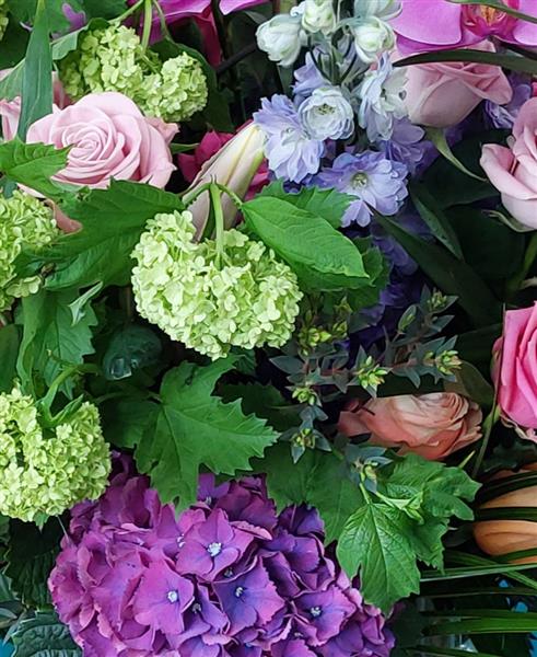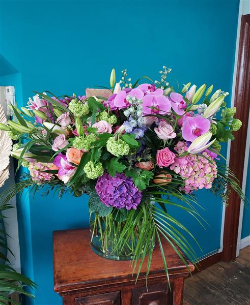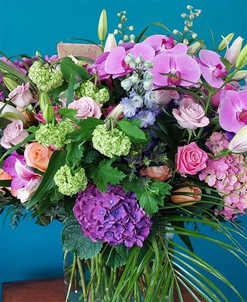 This Vase is filled with our most wow stems available in summer blue, pink, green, purple and peach.