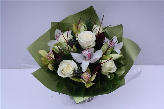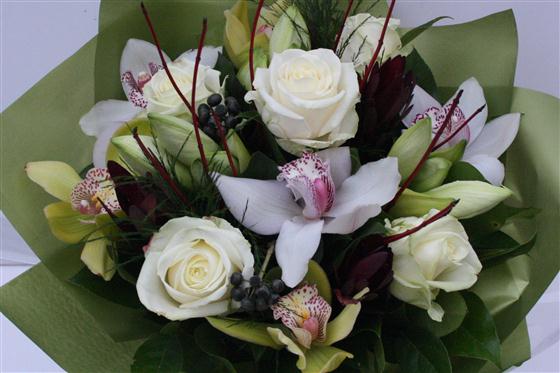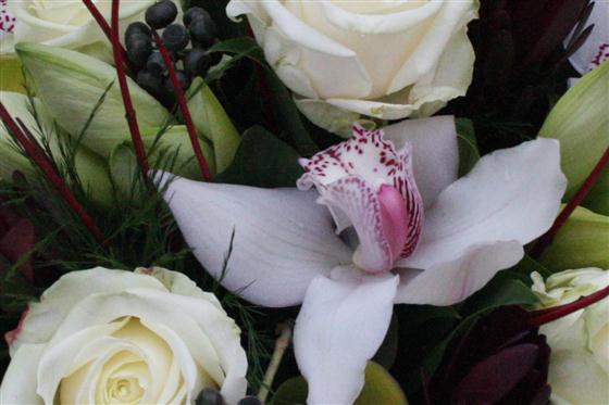 Cream roses and cymbidium orchids are the focal point of this exotic bouquet.