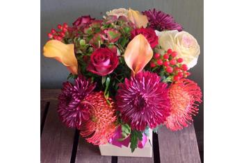 A warm mix of autumn pinks and reds including roses, berries and hydrangeas with a touch of the exotic.