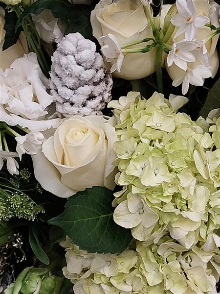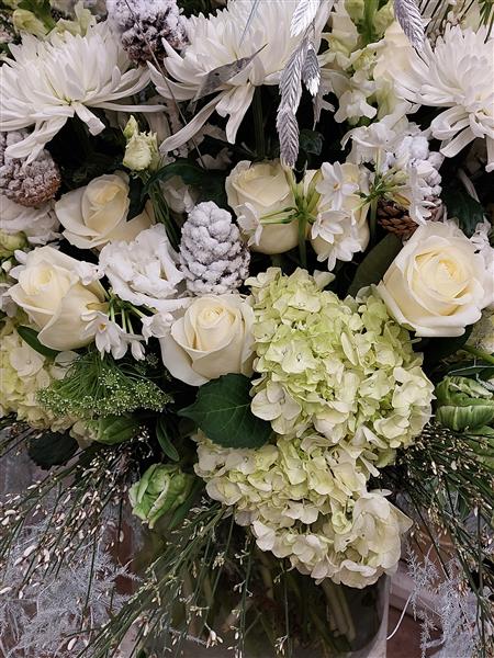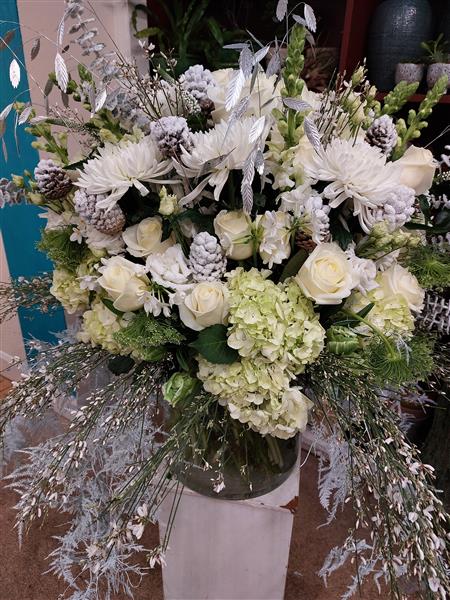 This vase is inspired by the winter months with white, sliver and green.