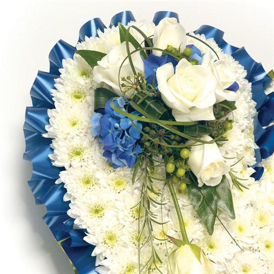 Classic chrysanthemum based heart shaped tribute with Roses, Freesia & Hypericum and complementary ribbon edge. Please choose your colour. Size- standard 12 inches, medium 15 inches and large 18 inches