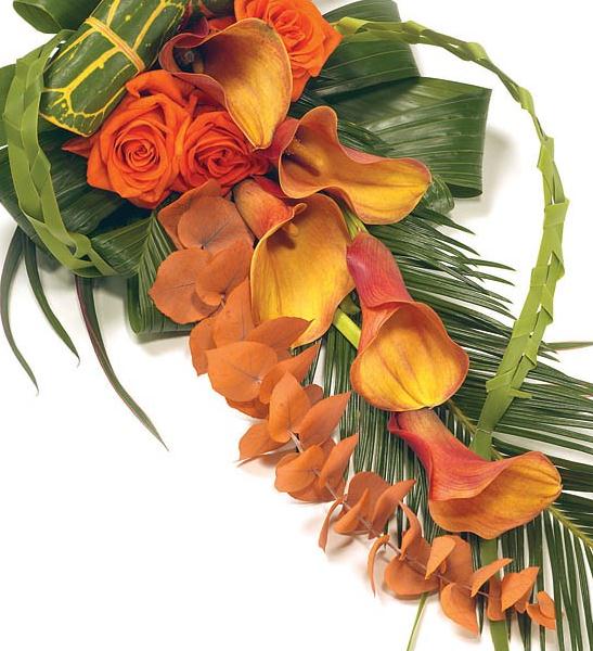 Calla lily and rose sheaf in shades of orange.