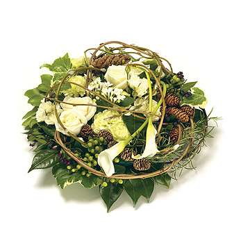 A stunning, contemporary, posy arrangement in shades of white & green, including Calla Lilies, Roses, Carnations, Bouvardia, Pine Cones, Willow and complementary foliage. Size: 31cm (12").