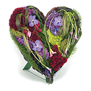 A contemporary heart shaped tribute in stunning purple and deep pink tones. Purple Vanda Orchids and Hydrangea mixed with pink Calla Lilies, Roses and red Carnations complete the design.