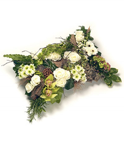 A stunning textured pillow design in shades of green & white, featuring Roses, exotic Orchids, Chrysanthemums, Hydrangea and complementary foliage. Size: Height - 33cm (13") Length - 51cm (20").