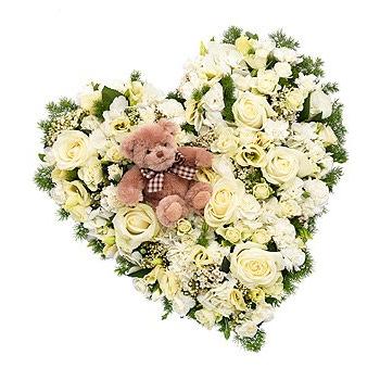 A classic white Rose and Hydrangea heart with Carnations and cream Lisianthus. Size is 21"