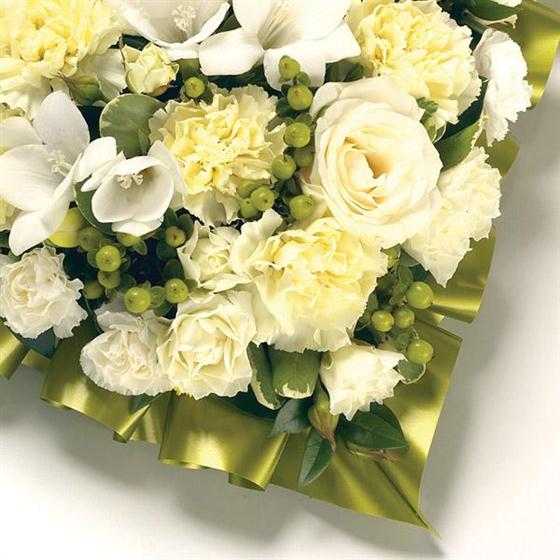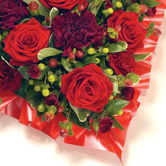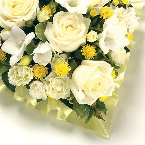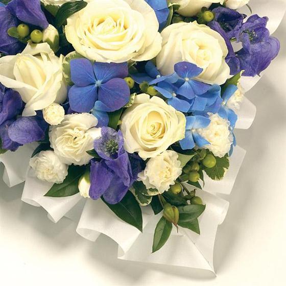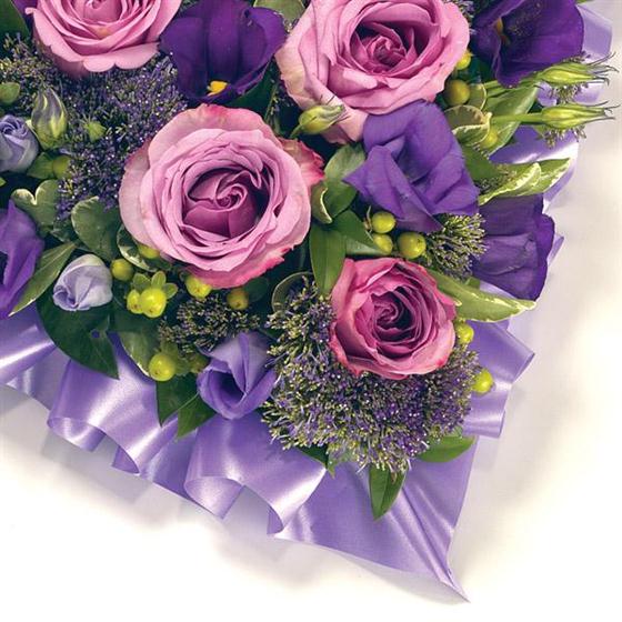 A beautiful pink & white coloured heart shaped tribute, featuring Roses, Eustoma, Chrysanthemums, fragranced Freesias and complementary foliage with a ribbon edge in the colours you choose. Standard size-12inch, Luxury size-15inch and supreme size-18inch