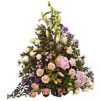 A luxurious pastel arrangement featuring pink and cream Roses, pink and purple Phlox, pink Lilies and Hydrangea with a generous array of foliage. stands around 2 foot tall.