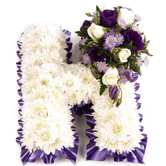 A formal design of massed chrysanthemums are used to create a personalised tribute. Ribbon surround and sprays are available in your choice of colours. Please note the standard price is for a single letter.