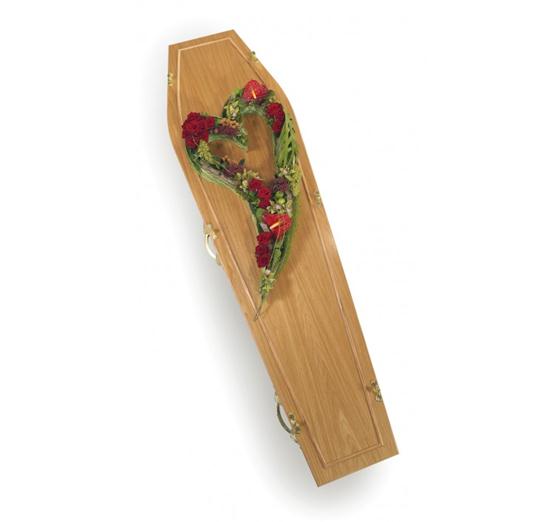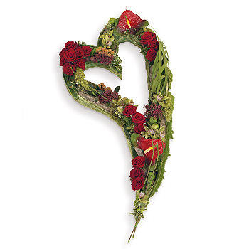 A contemporary and striking open heart shaped design, featuring Roses, exotic Orchids, Carnations and tropical foliage with a natural foliage edge and subtle use of willow and grasses. Size: Height - 87cm (34") Width - 43cm (17").