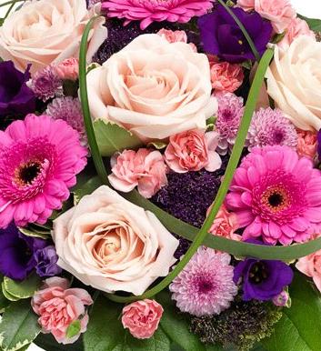A pretty pink and purple posy pad featuring pink Roses and Carnations, cerise Germini, purple Lisianthus and Trachelium with lavender Chrysanthemums. Size Standard 10inch, Medium 12inch and large 14inch