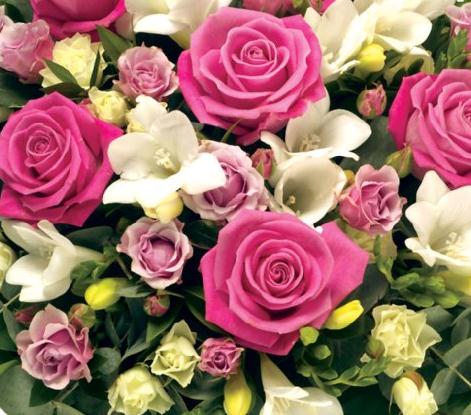 A delicatly fragrant pink and white posy pad featuring pink and white Roses and white Freesias. Size- Standard 10 inches, medium 12 inches and large 14 inches.