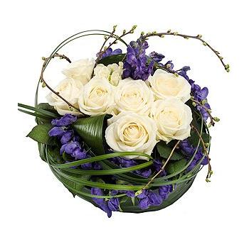 A stunning posy pad of white and cream Roses neatly nestled with purple Aconitum. Aspidistra leaves and Lily grass foliage complete the design. standard size 10"