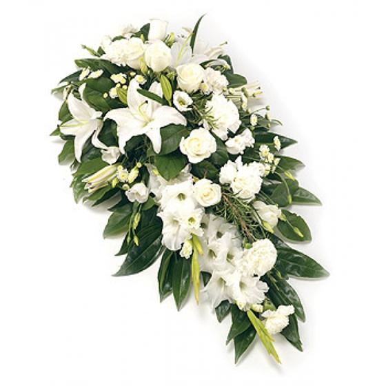 A classic single ended spray of white Roses, Lilies, Eustoma and Gladioli with dark green foliage. Size: 40cm (16").