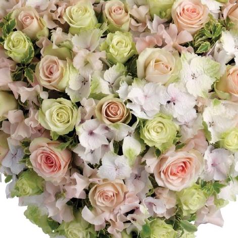 Pink Rose, Green Rose, Pink Hydrangea, Pink Sweet Pea, Variegated Pittosporum. Standard size 10inch and large 12inch