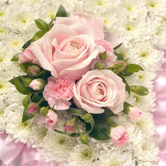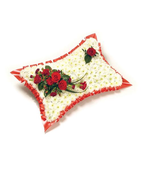 A classic white Chrysanthemum based pillow with ribbon edge. Featuring Roses, Carnations, Hypericum and complementary foliage. Standard size: 16" luxury 20".
