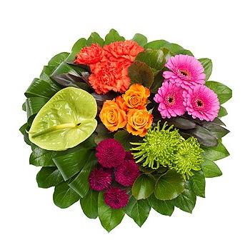 A stunning vibrant posy pad. An orange Rose, cerise Germini, green and purple Chrysanthmums, orange Carnations and red Cordyline on a bed of green foliage. Standard size 14"