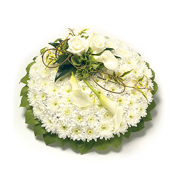 A white Chrysanthemum based posy with foliage edge, decorated with a classic spray of white Roses, Calla Lilies and complementary foliage. Size: 14" luxury 16"
