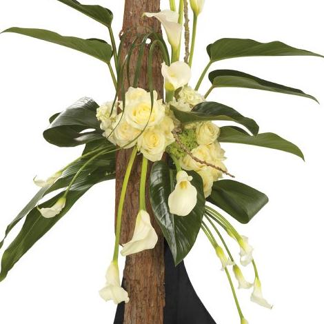 A white Calla Lily posy stand. White Roses and Hydrangea complemented by Philodendron and Aspidistra leaves with a touch of Lily Grass complete this exquisite arrangement perfectly.